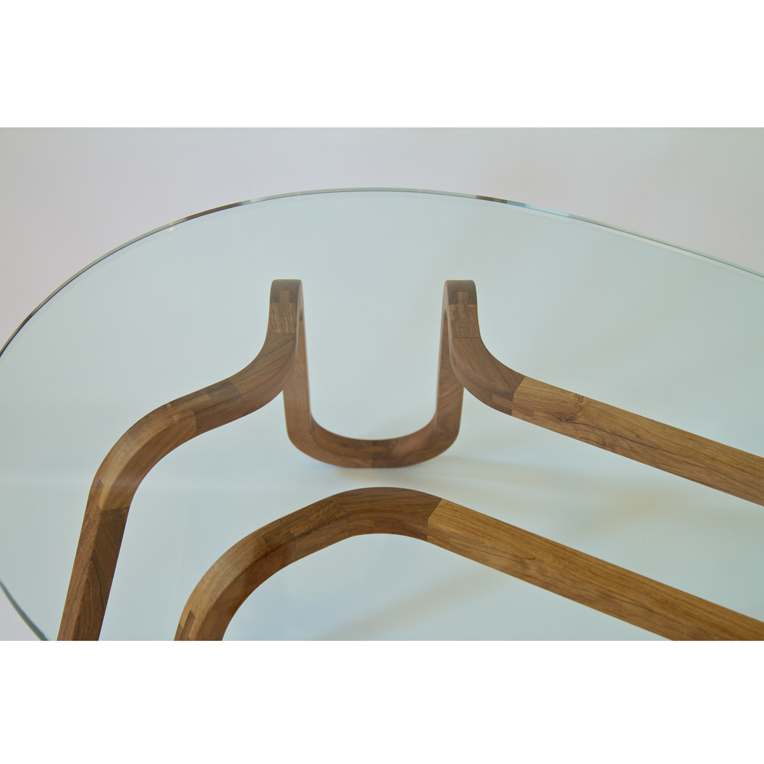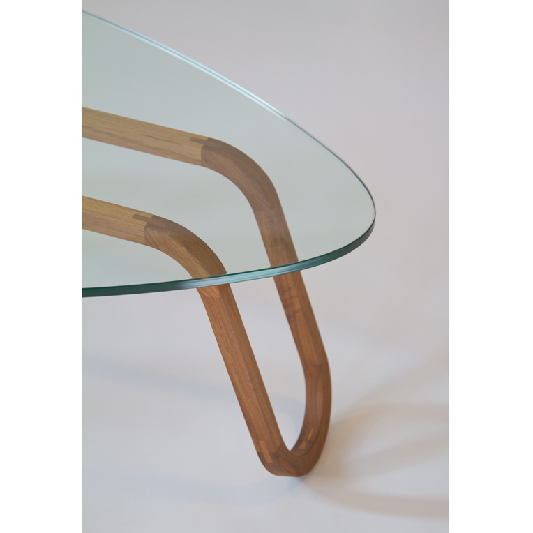 The curved timber leg frame on this coffee table is designed to look like one continuous piece of wood.