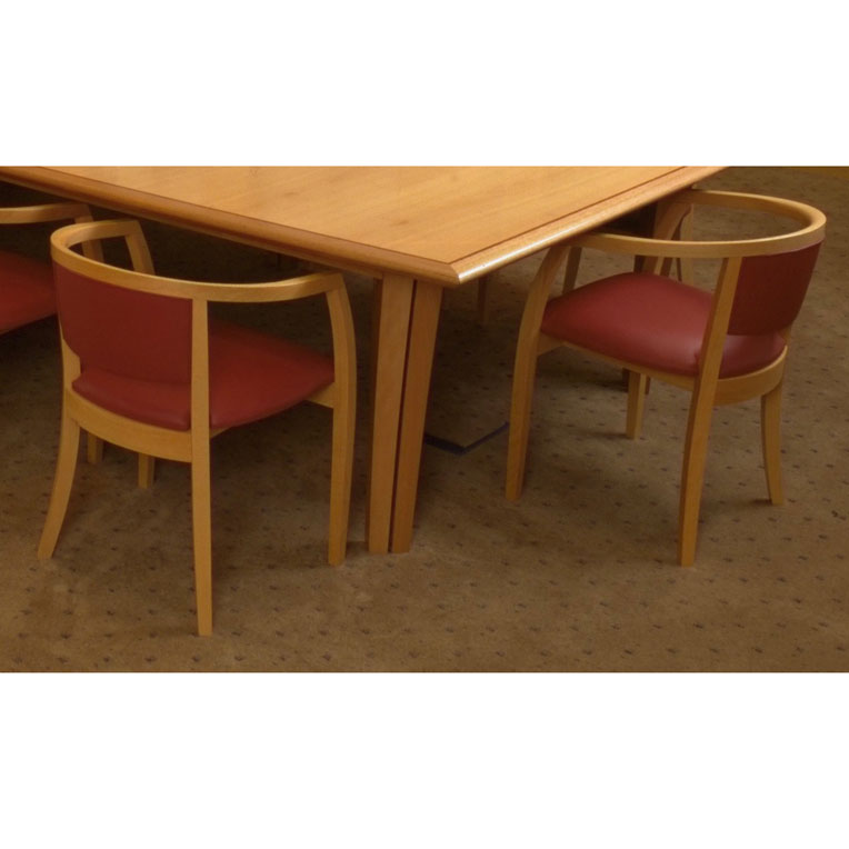 Designed to seat 24, this boardroom table and chairs was commissioned by Scotch College, Melbourne. The table top features bookmatched wide Beech veneer, with an inlay of Red Gum. The chairs are made from Solid Beech, with fine leather upholstery.