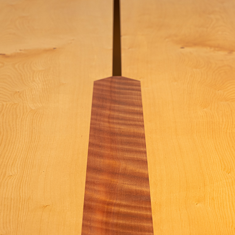 This eight-seat dining table is a study in contrast— organic yet refined, natural yet deliberate. The tabletop is crafted from two single bookmatched slabs of Huon Pine, their grain flowing seamlessly from one side to the other to create an arresting symmetry.