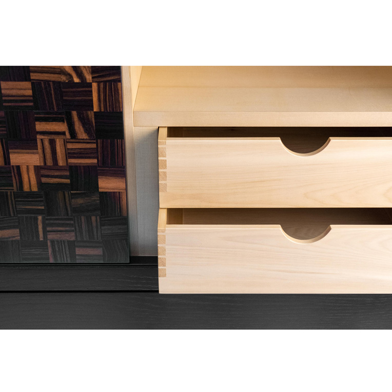 Ebonised Oak cabinet, with Macassar Ebony doors. Interior of cabinet lined with Golden Sassafras. Celery Top Pine drawers. Hinges and handles in nickel silver.