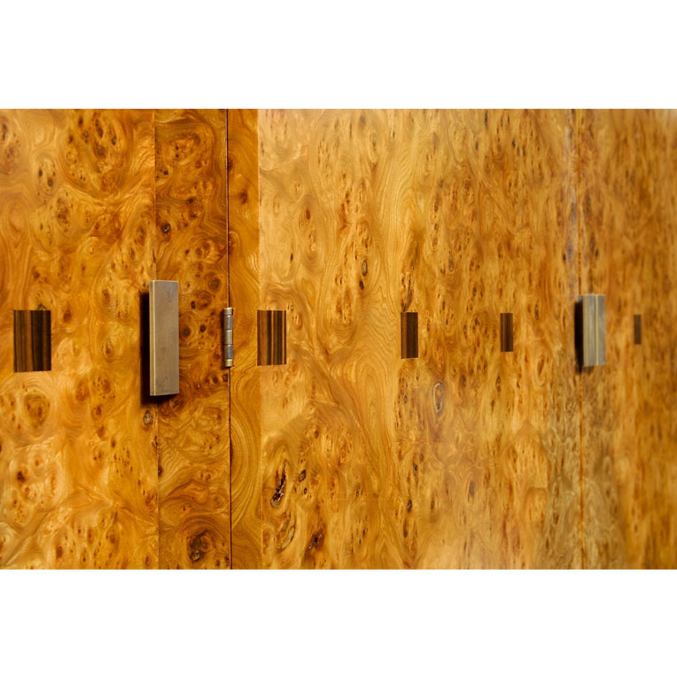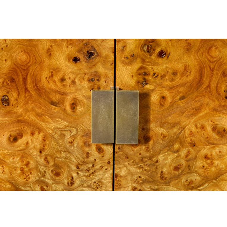 Book matched Burr Elm veneer. Originally designed as a storage unit, this cabinet can also be made to hold a TV.