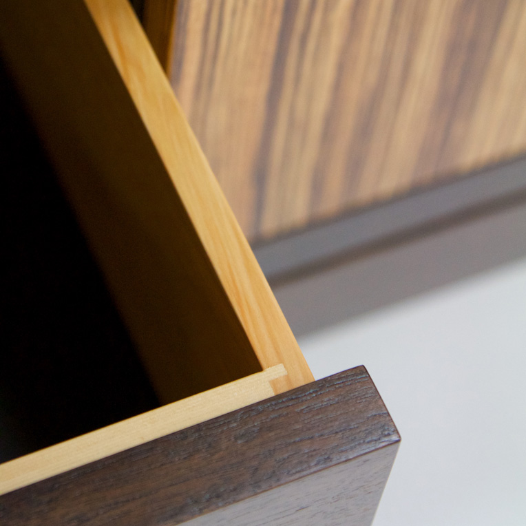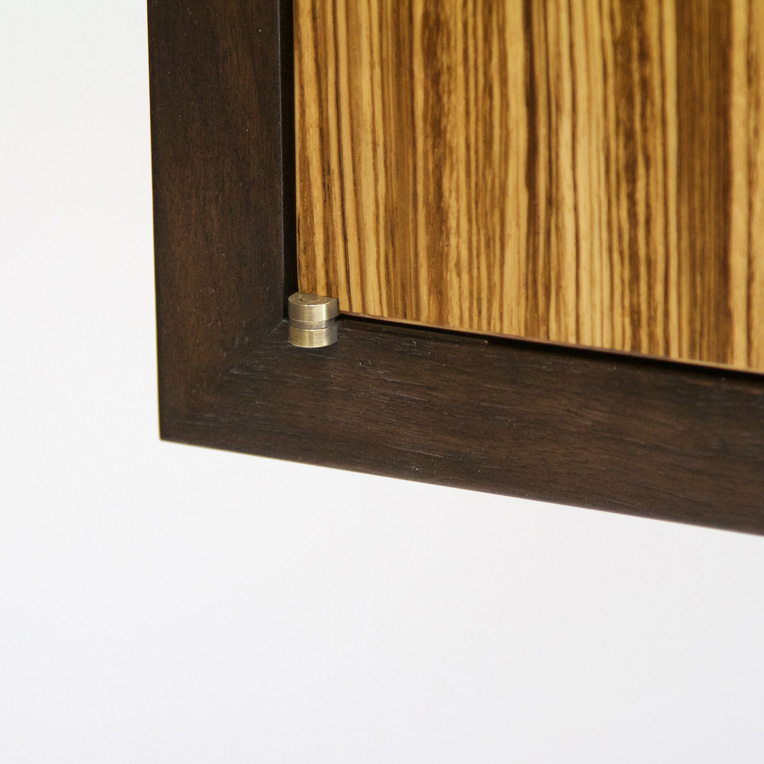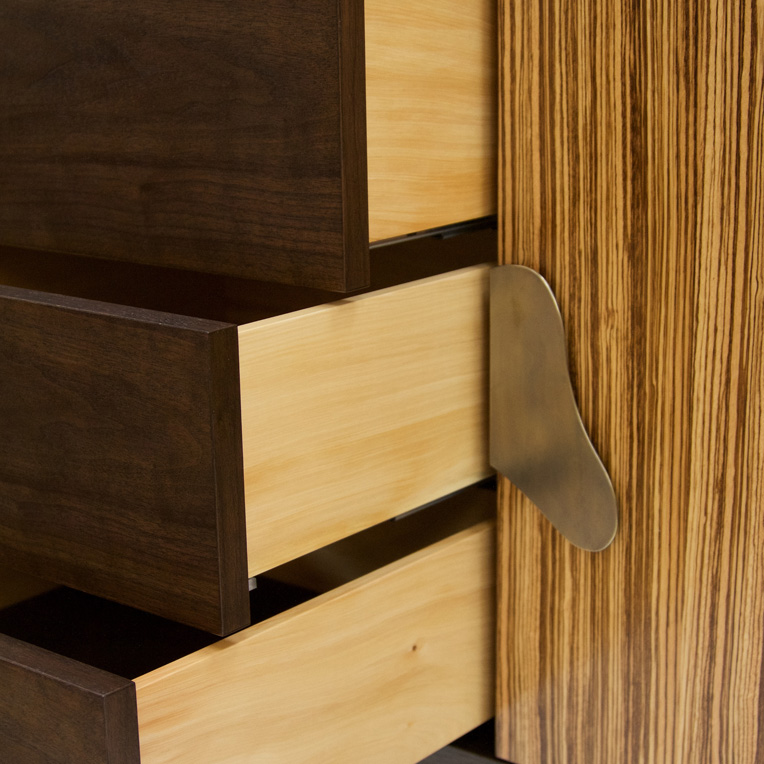 A feature cabinet made from rich dark stained Walnut, with contrasting feature Zebrano doors. The interior features push to open drawers and adjustable shelving. The aged bronze handles are hand made by Anton Gerner.